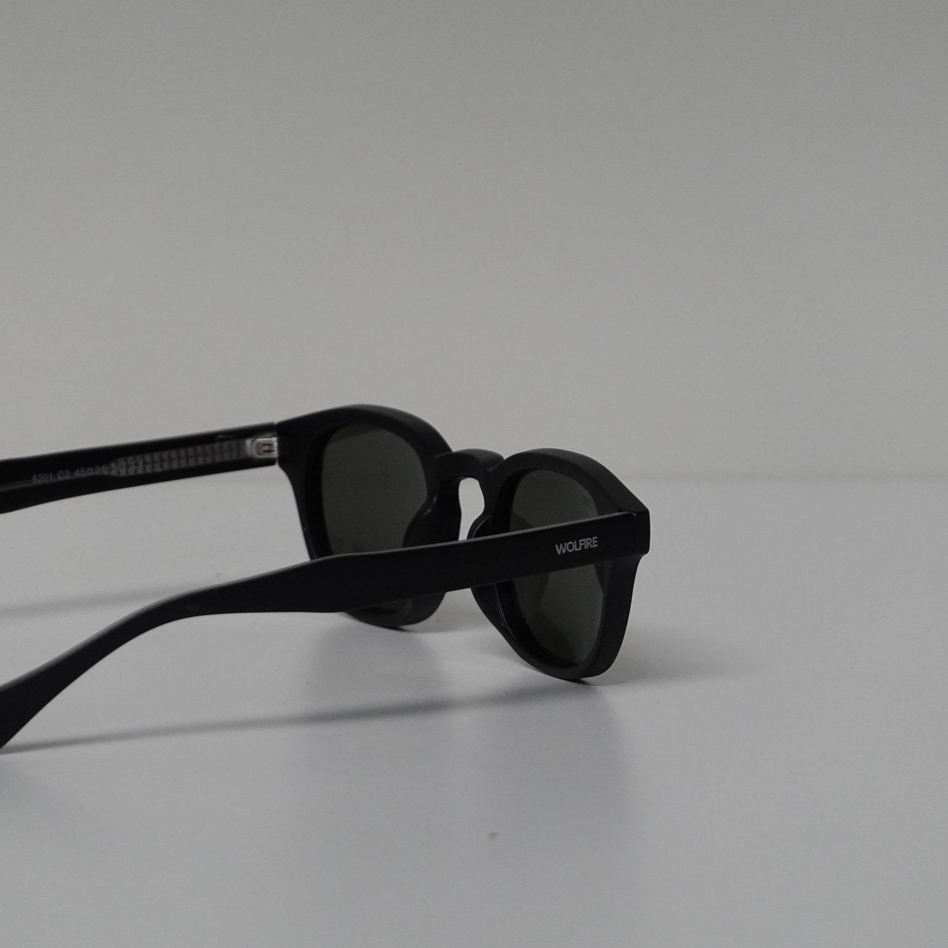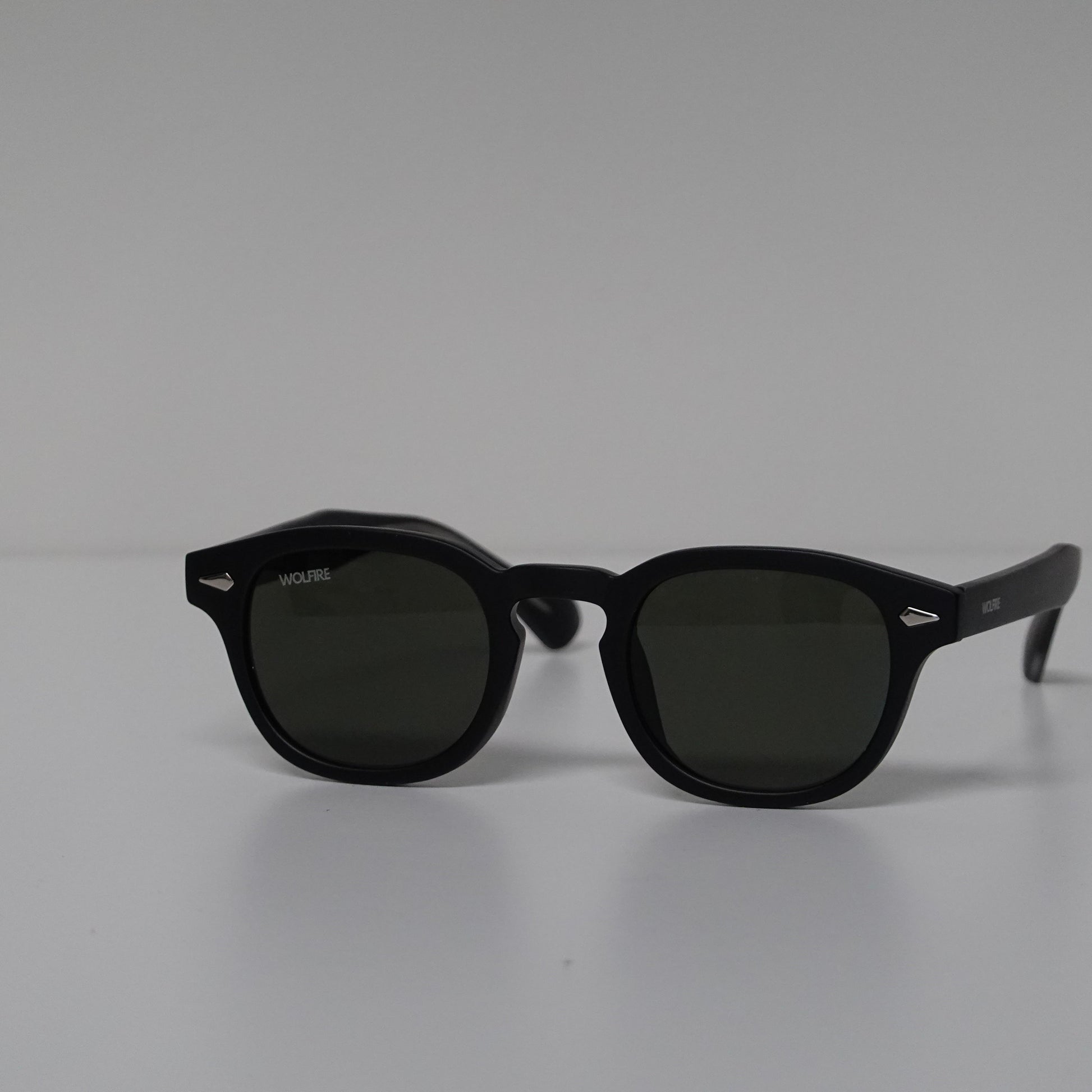 Sleek matte black frames with green lenses, stylish Wolfire sunglasses, UV protection, lightweight, ideal for a bold, modern look.