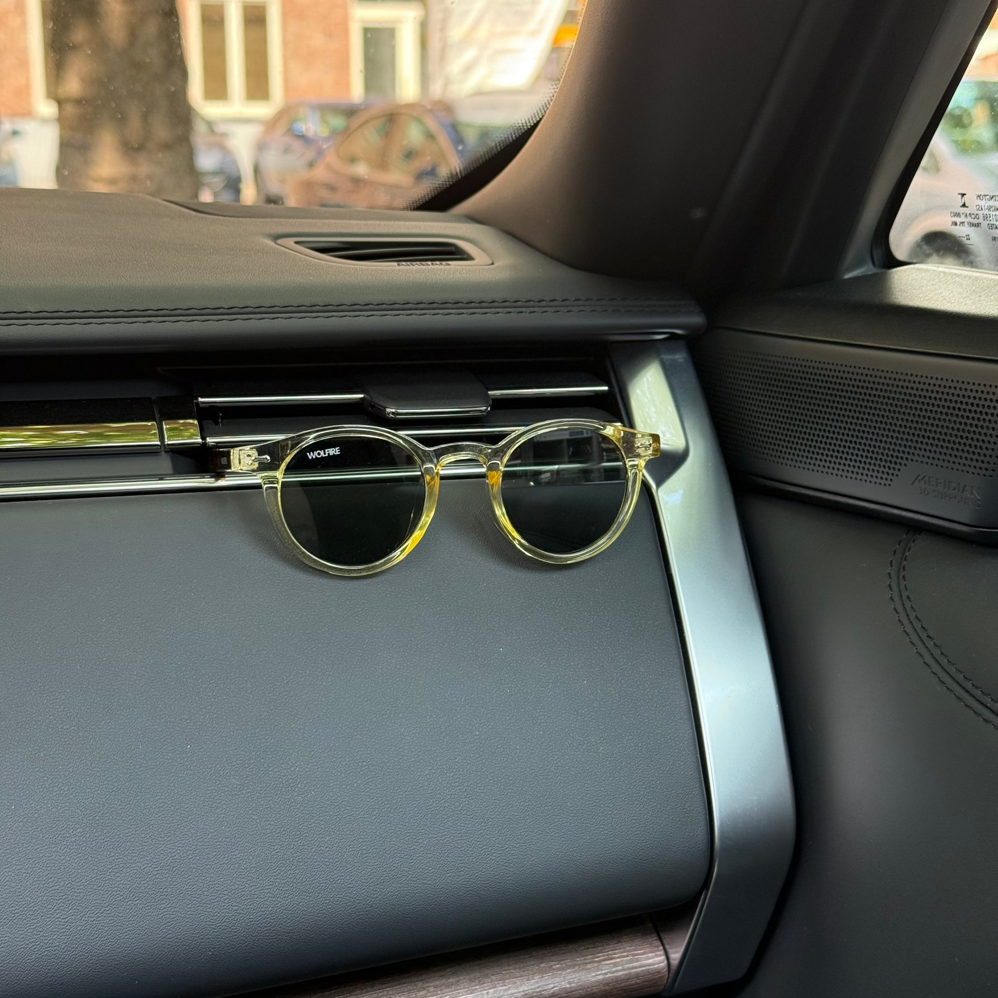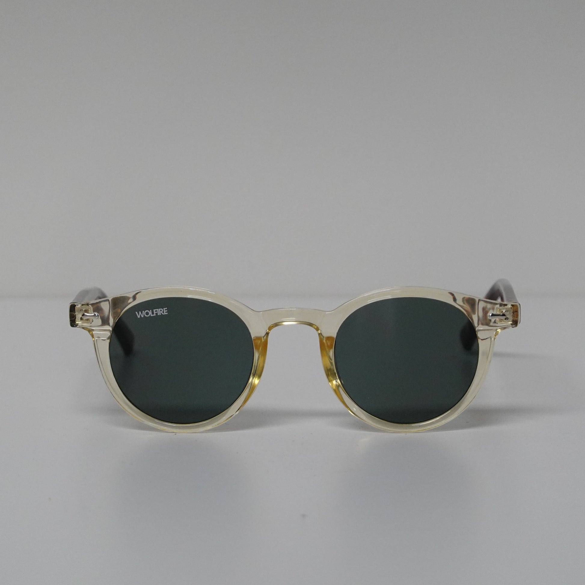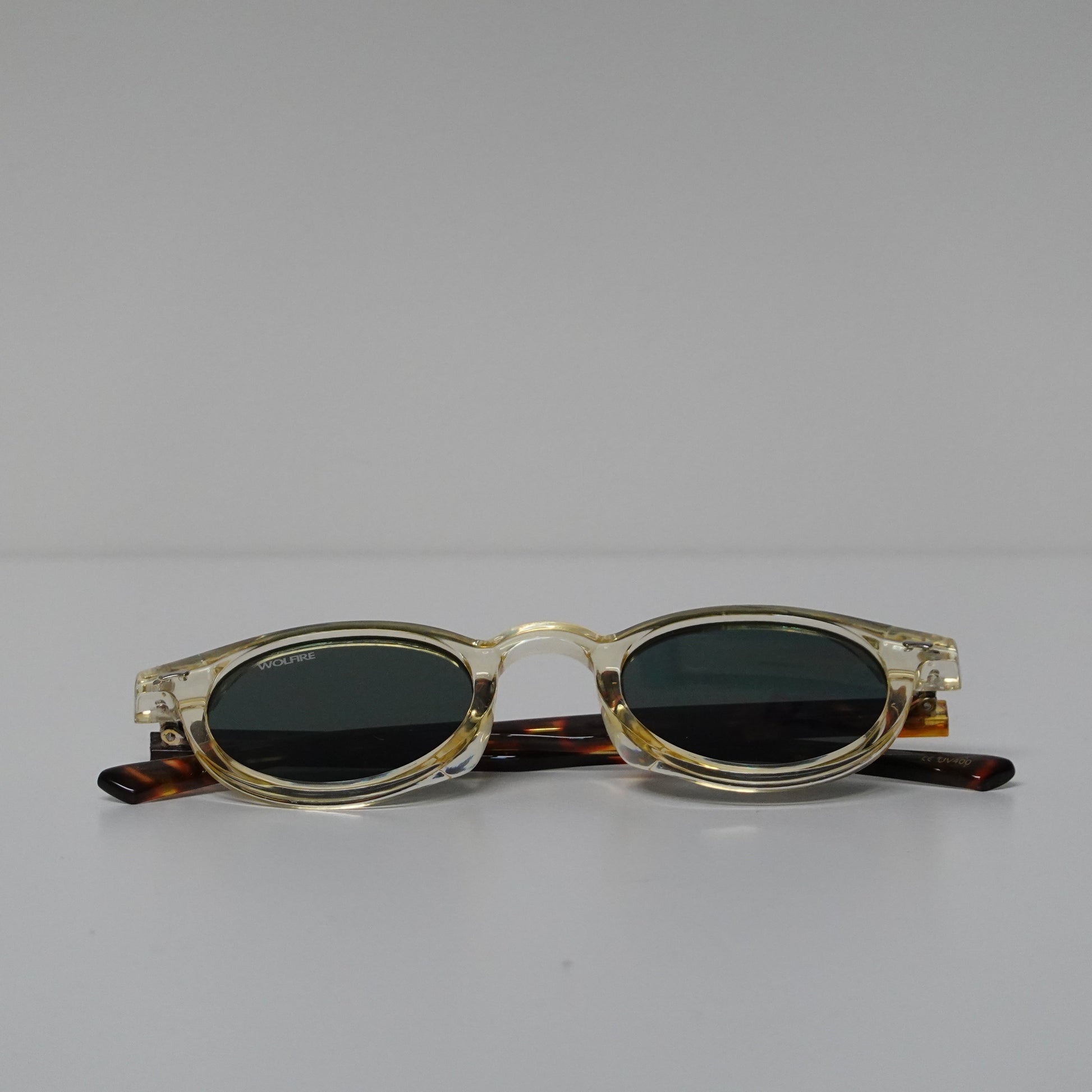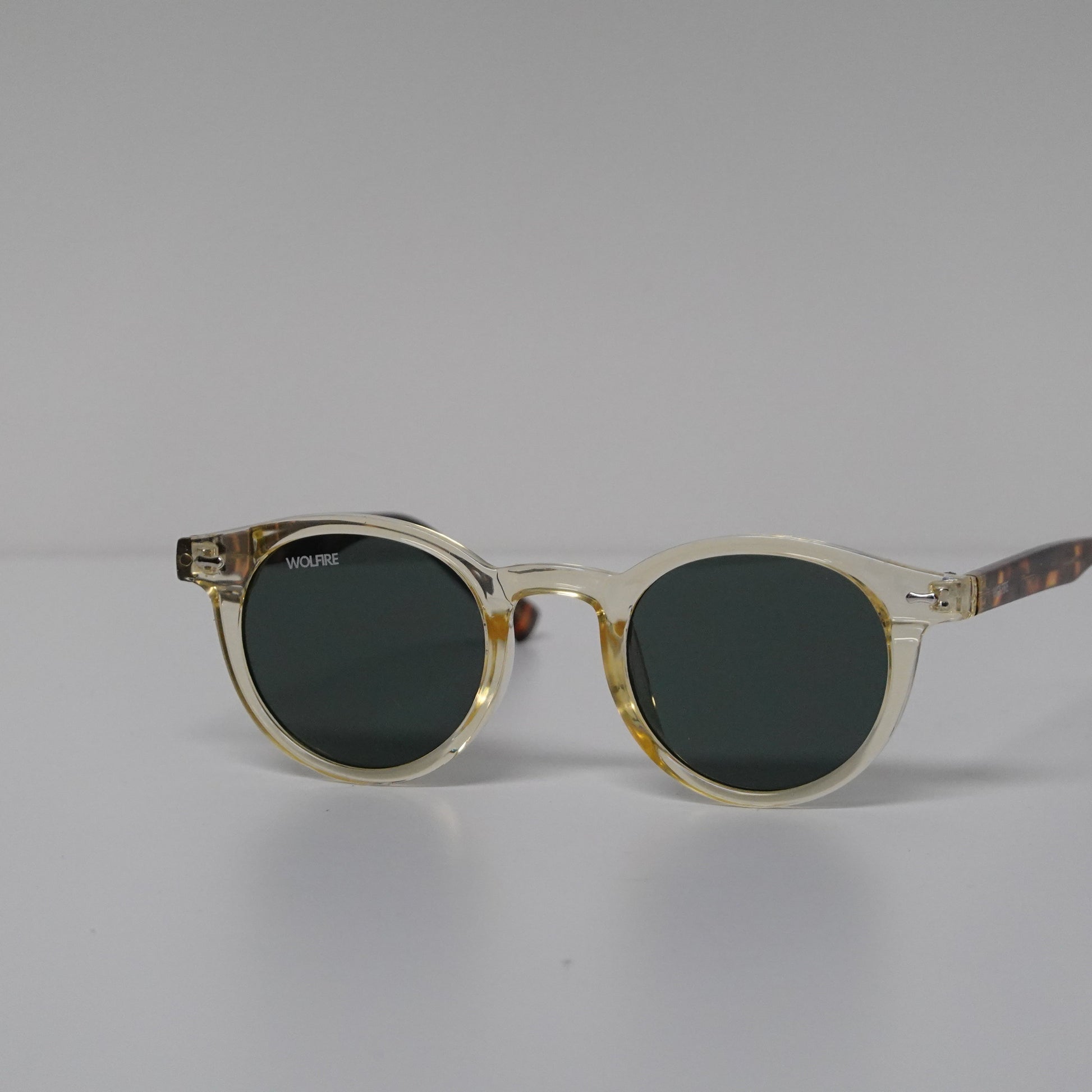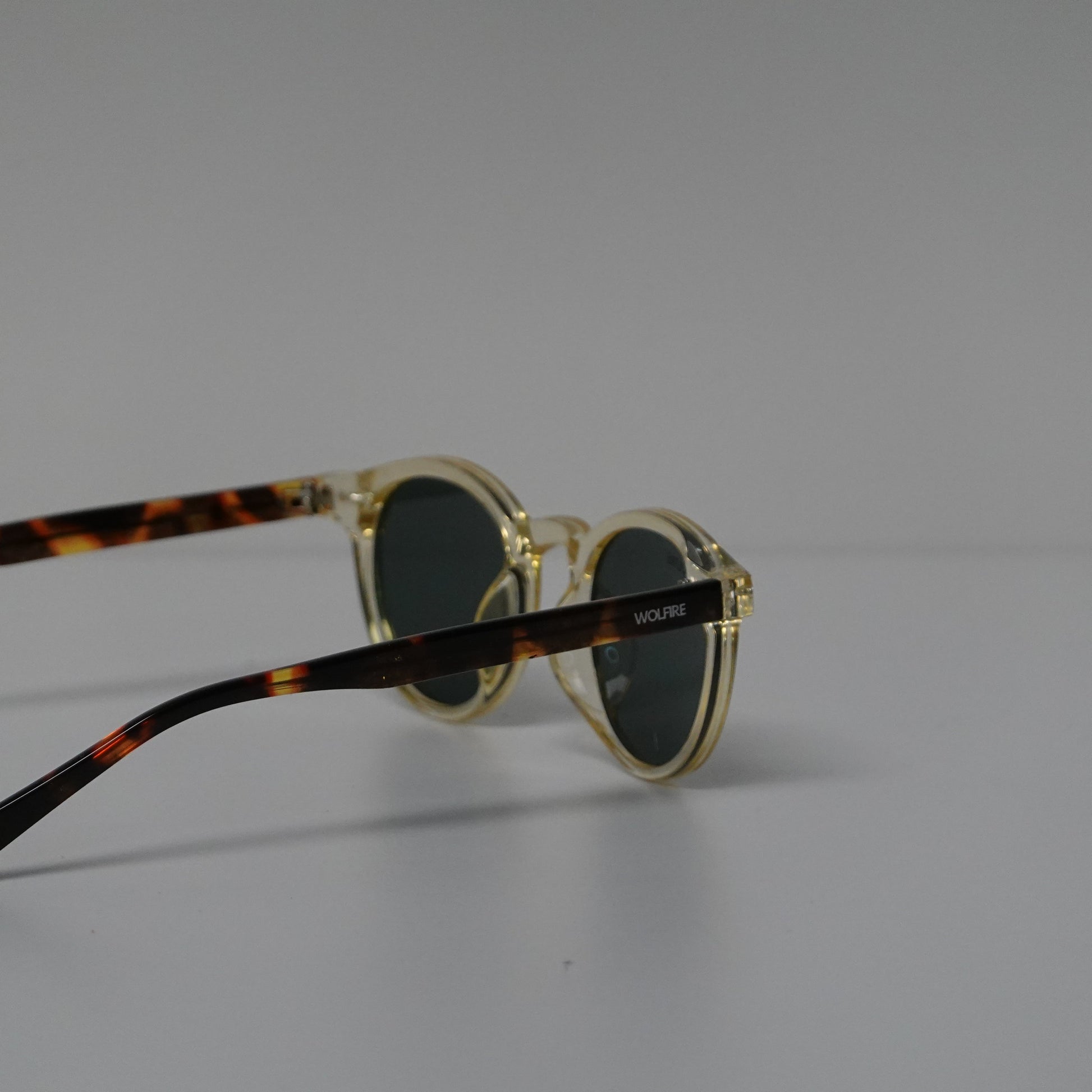 Amber frames with tortoise temples and green lenses, sleek Wolfire sunglasses, elegant design, UV protection, lightweight, perfect for a bold, stylish appearance.