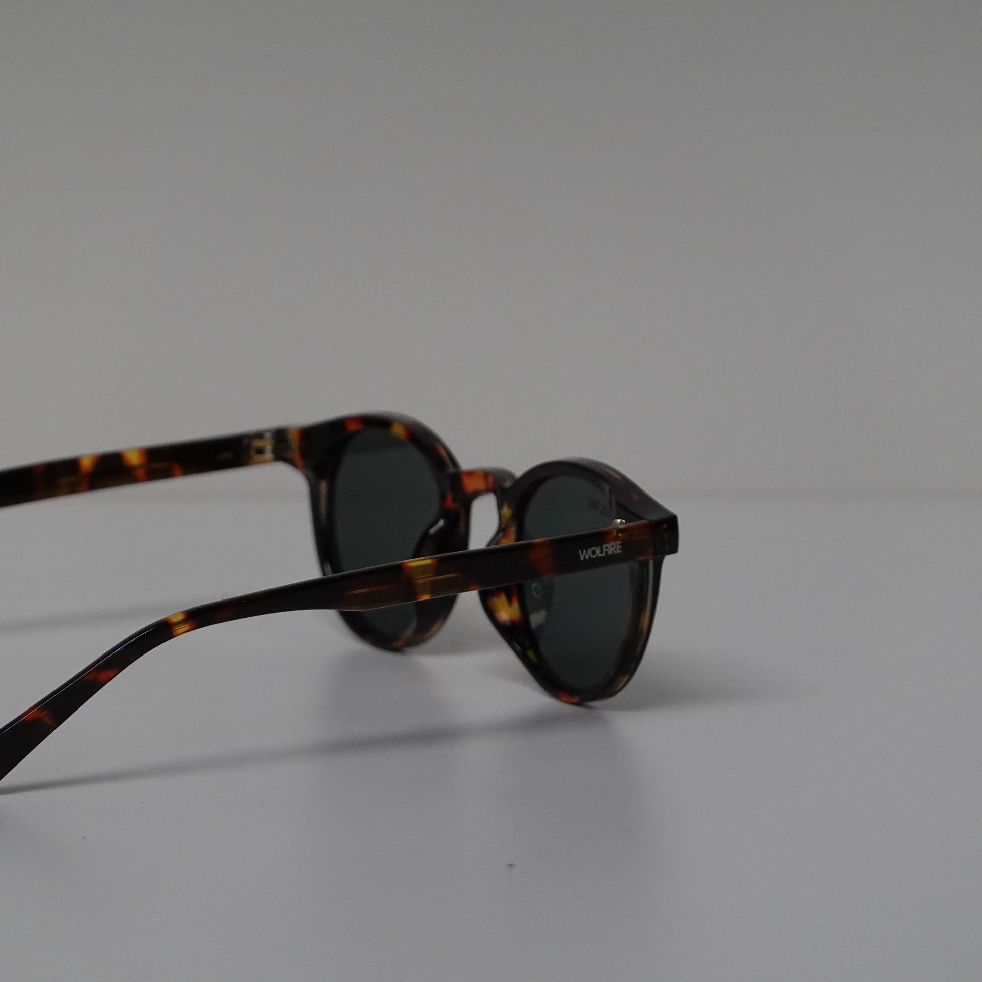 Tortoise frames with dark green lenses, sleek Wolfire sunglasses, timeless design, UV protection, lightweight, ideal for a classic, nature-inspired look.